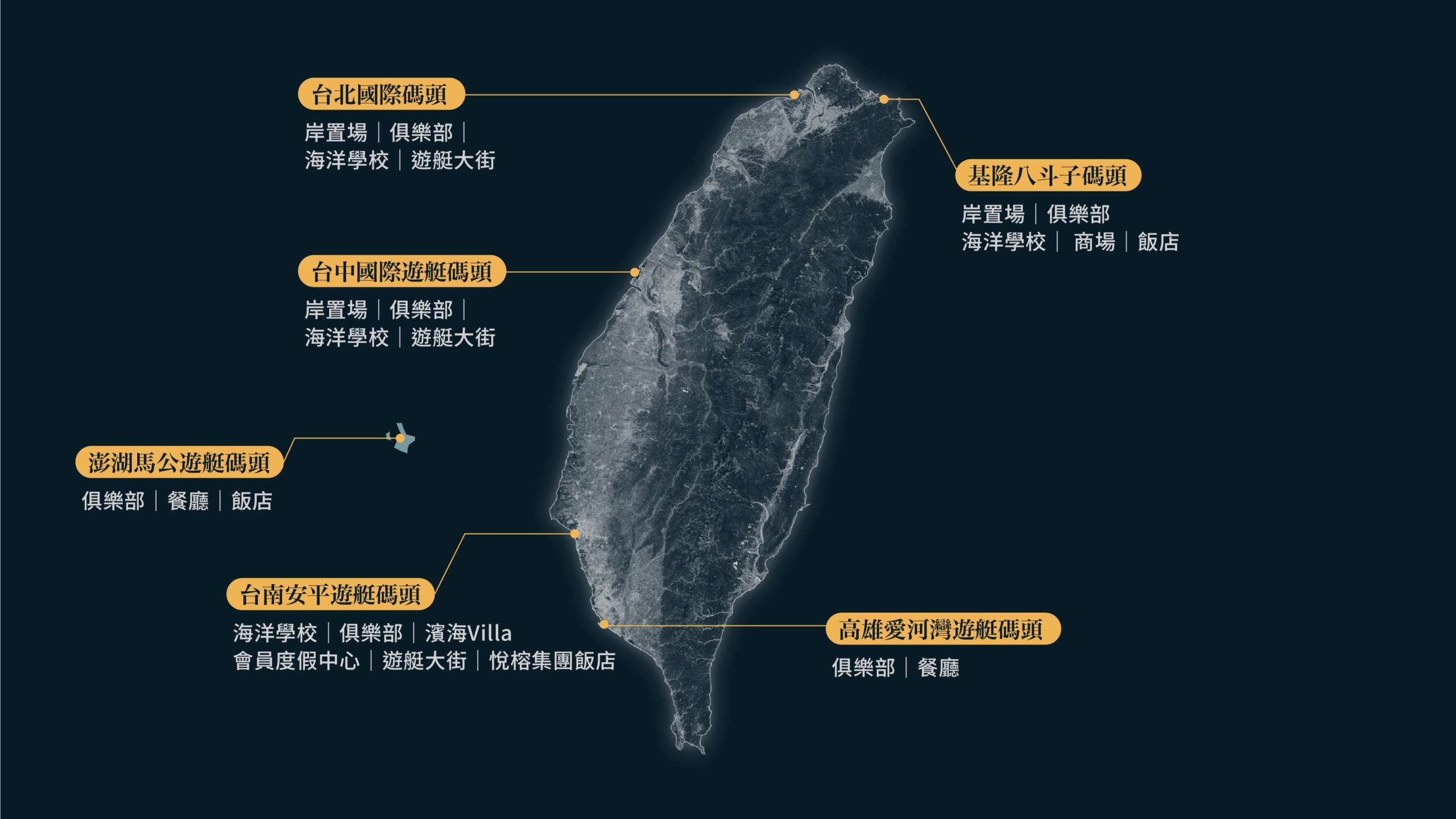 亞果遊艇集團在全台6城市設有專屬碼頭,包含基隆、台北、台中、台南、高雄及澎湖,形成西海岸「海上休憩廊帶」;除基隆、台北與台中碼頭為近年新增據點,仍在進行開發與規劃,其餘碼頭均已建置完成。